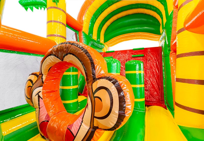 Plezier voor groot en klein dankzij deze superleuke stormbaan van 9,5m. lang in het thema leeuw/jungle.